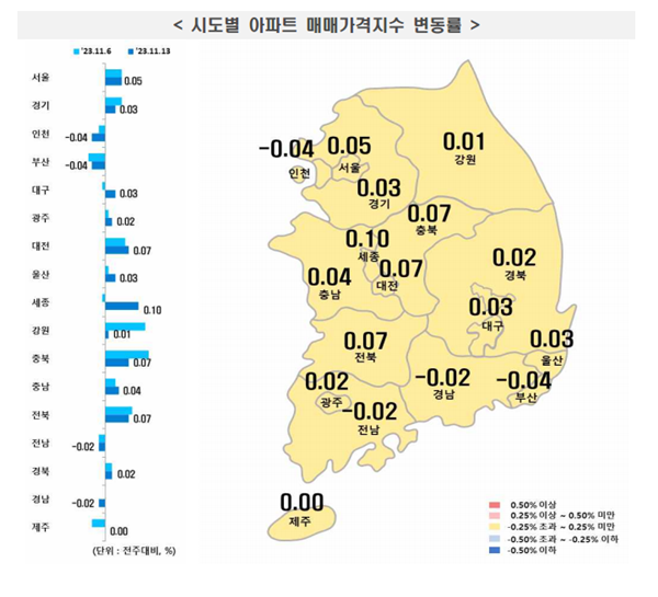 지방(0.02%)은 시ㆍ도별로 부산(-0.04%), 대전(0.07%), 대구(0.03%), 충남(0.04%), 충북(0.07%), 강원(0.01%), 광주(0.02%), 울산(0.03%), 세종(0.1%), 전남(-0.02%), 전북(0.07%), 경남(-0.02%), 경북(0.02%), 제주(0%) 등의 결과를 보였다.