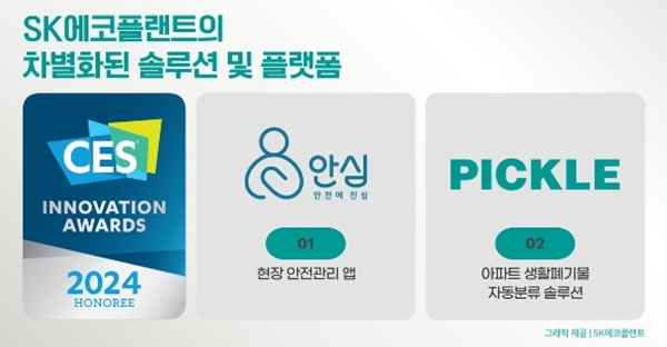 SK에코플랜트의 폐기물 솔루션 피클(PICKLE)은 지속가능성, 친환경 디자인&스마트에너지 부문에서, 안전관리 플랫폼 안심(안전에 진심)은 디지털 헬스 분야에서 각각 수상한다.