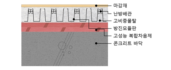 설계ㆍ시공ㆍR&D 분야 전문인력으로 구성된 소수 정예팀인 `A팀`이 주축이 돼 개발한 리모델링 특화 바닥 차음 시스템은 70mm 일괄타설 몰탈 구조를 구현하기 위한 방진모듈판, 포스코의 친환경 부산물로 만든 고비중 몰탈, 발포 열가소성 폴리우레탄(ETPU) 신소재를 활용한 복합ㆍ점지지 차음구조가 핵심이다. 이 시스템을 적용하면 국토교통부에서 규정하는 동등한 수준의 차음 성능을 확보할 수 있게 된다.