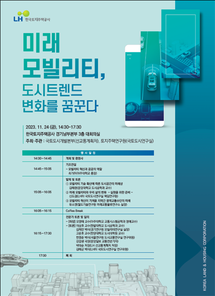 [아유경제=송예은 기자] 한국토지주택공사(LH)는 오는 24일 `미래 모빌리티, 도시트렌드 변화를 꿈꾼다`는 주제로 미래교통 컨퍼런스를 개최한다고 밝혔다.