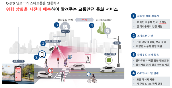 어린이 보호구역 C-ITS 안전 특화 서비스는 CCTV, 라이더, 초광대역 등 검지장치를 활용해 차량과 보행자의 정확한 위치정보를 파악하고 이를 별도 단말기 또는 스마트폰 앱을 통해 운전자에게 충돌위험을 미리 경고해 주는 정보를 제공하는 기술이다.