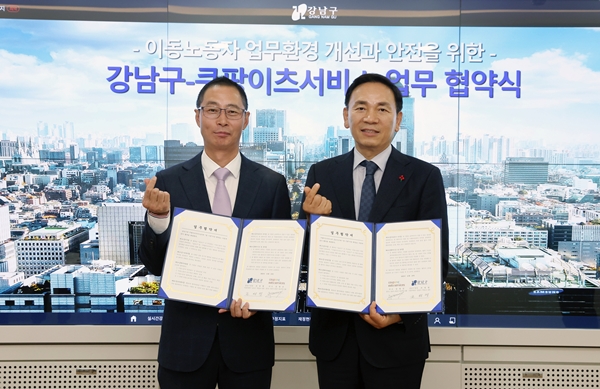 [아유경제=송예은 기자] 서울 강남구(청장 조성명)가 지난 23일 배달서비스 전문업체인 쿠팡이츠서비스와 업무협약을 체결하고, 오는 29일과 30일 강남 이동노동자 쉼터 2호점에서 이륜차 무상점검 안전 캠페인을 실시한다고 밝혔다.
