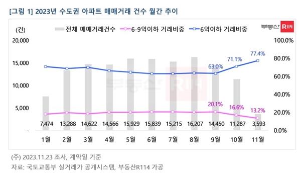 특히 특례보금자리론 일반형이 종료되고 우대형만 남은 지나 9월 말 이후 6~9억 원대 거래는 감소한 반면 6억 원 이하는 증가하며 주택 거래에 정책모기지의 영향력이 확인된 만큼, 내년 신생아특례대출 출시 전까지 저가 급매물 위주의 계약이 간간이 체결되는 상황이 이어질 것이라는 전망이다.