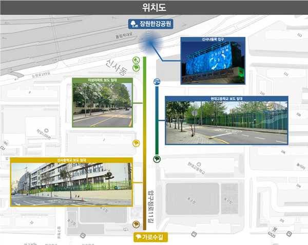 이 길의 보도는 신사중학교, 현대고등학교, 미성아파트 등의 건물의 담장을 따라 이어진다. 구는 도심 속 한강으로 이어지는 길을 보행자가 걷기 좋은 산책로로 바꾸기 위해 민관거버넌스 워크숍을 열고 공공디자인을 입혔다.