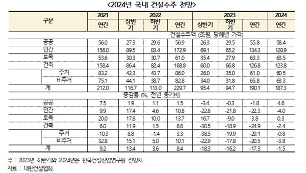 한편, 한국건설산업연구원이 이달 2일 내놓은 `2024 건설ㆍ부동산 경기 전망` 자료에 의하면, 2024년에도 국내 건설 수주가 전년 대비 1.5% 감소할 전망이다. 내년에도 고금리 상황의 장기화ㆍ부동산 PF 문제ㆍ대내외 불확실성이 큰 만큼 2년 연속 감소할 수 있다고 예측했다.