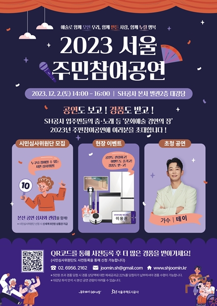 [아유경제=조명의 기자] 서울주택도시공사(SH)는 다음 달(12월) 2일 `2023년 서울 주민참여공연`을 개최한다고 28일 밝혔다.