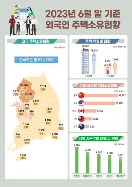 외국인 8만5358명이 소유한 주택은 총 8만7223가구로, 전체 주택(1895만 가구ㆍ2023년 가격공시 기준)의 0.46% 수준이다. 외국인 보유주택의 국적별 비중은 중국(54.3%), 미국(23.5%) 등으로 나타났고, 지역별로는 경기(38%), 서울(25.6%), 인천(9.7%) 등 대부분 수도권(73.3%)에 분포하는 것으로 확인됐다. 소유주택수별로는 1주택 소유자가 대다수(93.4%)인 것으로 나타났다.