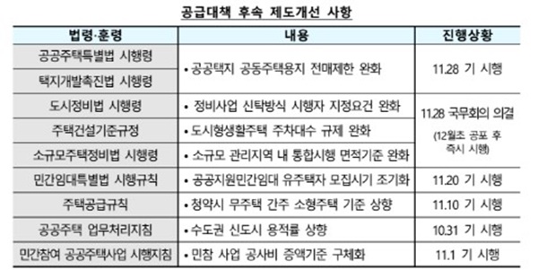 한편, 국토부는 「주택공급 활성화 방안」에 따른 제도 개선(9개 법령ㆍ훈령) 모두 완료됐으며, 청약시 무주택 간주 주택 기준 상향(이달 10일 시행), 공공택지 전매 제한 완화(이달 28일 시행), 도시형 생활주택 주차대수 규제 완화(오는 12월 초 시행 예정) 등이 시행됨에 따라 민간의 주택 공급 여건도 개선될 것이라고 기대하고 있다.