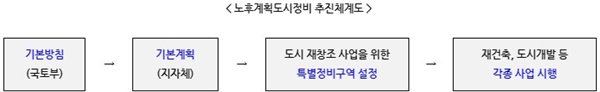 특별법에 ▲국토부가 수립한 가이드라인 `노후계획도시정비 기본방침(이하 기본 방침)` ▲지자체가 수립하는 세부 계획인 `노후계획도시정비 기본계획(이하 기본 계획)` 등의 근거를 명확히 담았다는 게 국토부의 설명이다. 이로써 추진 과정은 기본 방침(국토부)→기본 계획(지자체)→특별정비구역 설정→도시정비사업 시행으로 이어지며, 세부 내용은 2024년 중으로 발표될 예정이다.