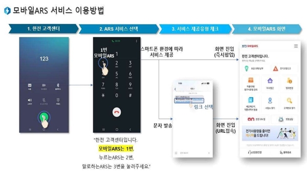 모바일 ARS 서비스를 이용하려는 경우 한전고객센터에 전화를 한 후 음성안내에 따라 상담사 연결과 모바일 ARS 중 모바일 ARS를 선택하면 휴대전화로 SMS가 전송된다. 전송된 SMS의 링크를 클릭하면 모바일 ARS 화면으로 이동한다.