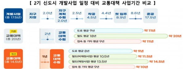 이어 국토부가 제시한 `2기 신도시 개발사업 일정 등` 자료에 의하면, 교통사업 기간은 도시정비사업 기간보다 뒤늦게 완성됐다. 실제로 도시정비사업은 평균 17.5년, 교통사업은 평균 20년 소요됐으며, 이로 인한 공백은 많은 국민에게 교통 불편을 야기했다.