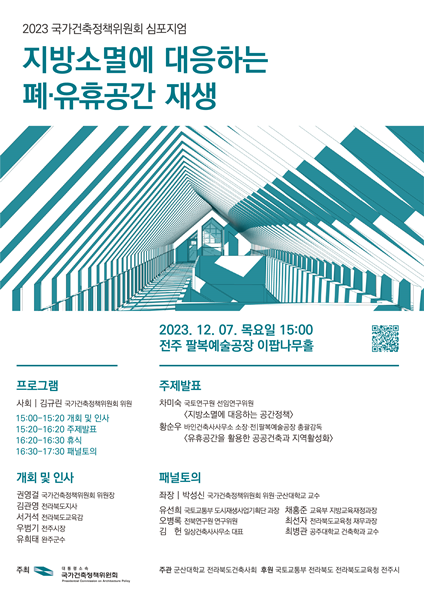 주제 발표는 `지방소멸에 대응하는 공간정책`과 `유휴공간을 활용한 공공건축과 지역활성화`라는 2개의 주제로 진행된다.