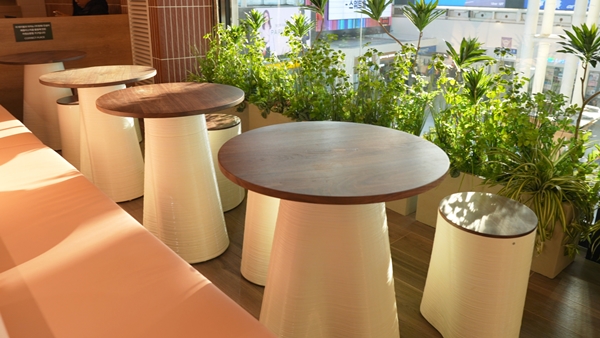 한화건설부문이 제작한 자원순환형 가구는 테이블, 의자, 벤치 3종 총 48점이다. ▲서울역민자역사(커넥트플레이스 서울역점) ▲포레나 도서관 등 9곳에 설치돼 이용객들에 자원순환 메시지를 전달하게 된다.