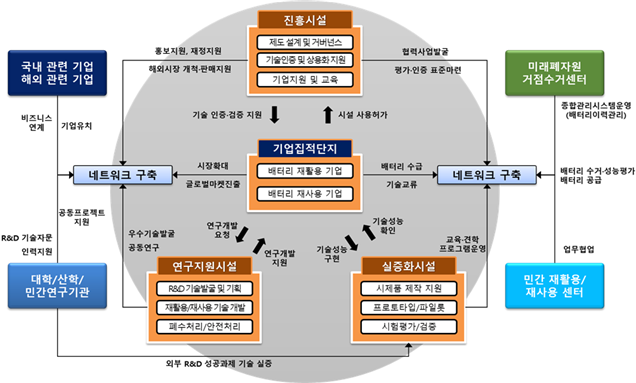 환경부는 전기차 배터리 자원순환 집적단지를 조성해 우리나라 기업이 전 세계 배터리 재활용시장을 선점하고, 핵심자원을 안정적으로 공급할 수 있는 기반을 마련할 계획이다.