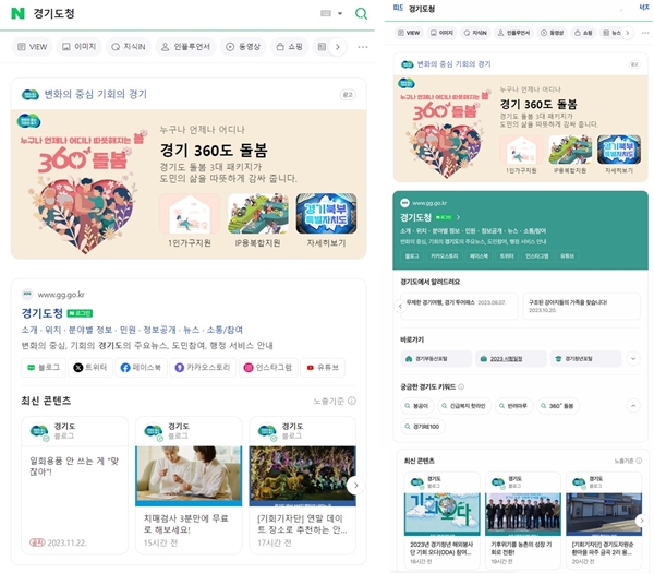 최근 경기도에 따르면 네이버에서 도 관련 공공정보를 검색하면 도에서 공식 제공하는 공공정보를 더 쉽고 직관적으로 확인할 수 있다. 가령 네이버에서 `경기도` 또는 `경기도청`을 검색하면 도 대표 누리집을 비롯한 도민 소통 채널까지 모두 확인이 가능하다. 여기에 청록색 배경을 더해 도의 상징성을 높였다.
