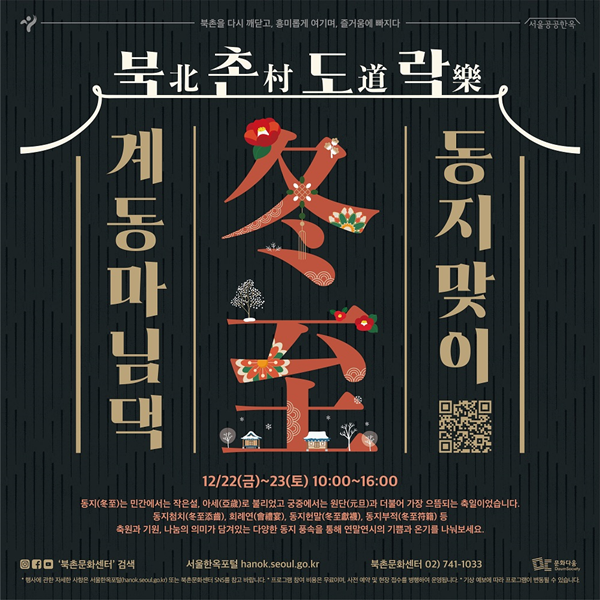 행사는 이달 22일과 23일 오전 10시~오후 4시까지 진행되며, 세시풍속을 기반으로 액운을 막고 다가오는 새해의 축원과 번영을 기원하는 체험ㆍ이벤트ㆍ장터 등 다양한 행사가 준비돼 있다. 특히 이웃을 살피고 서로 인사와 온정을 나누는 동지의 의미를 담아 북촌과 더불어 살아가는 이들과 함께하는 문화 나눔 및 장터가 열린다.