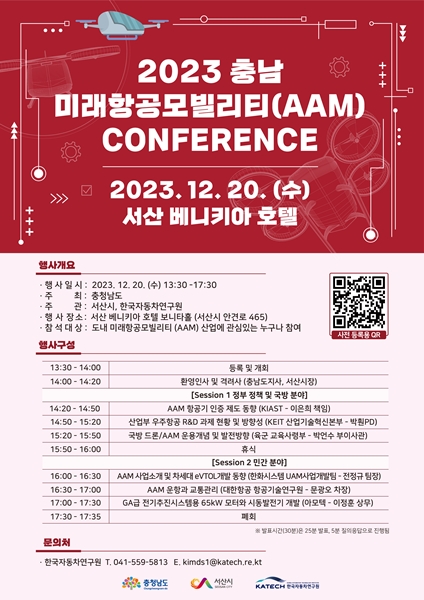 학술대회에서는 관련 기업과 전문가들이 참석해 미래항공모빌리티 항공기인증, 정부 연구개발(R&D) 과제, 국방 분야 미래항공모빌리티 발전??향 및 기업의 개발동향 등을 공유할 예정이다. 도는 학술대회에서 나온 다양한 의견을 바탕으로 충남의 미래항공모빌리티가 나아갈 방향을 도출한다는 방침이다.