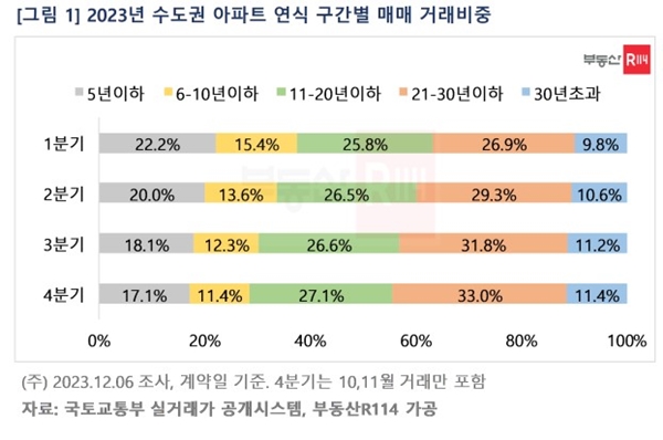 21~30년 이하 아파트 매매 거래비중은 1분기 26.9%에서 4분기 33%로 6.1p 늘며 증가폭이 가장 컸다. 11~20년 이하 아파트 거래비중은 1분기 25.8%에서 4분기 27.1%로, 30년 초과 아파트는 9.8%에서 11.4%로 각각 1.3%p, 1.6%p 늘었다. 반면 5년 이하 아파트 거래비중은 1분기 22.2%에서 4분기 17.1%로 5.1%p 감소한 것으로 나타났다. 6~10년 이하 아파트 역시 1분기 15.4%에서 4분기 11.4%로 4%p 줄었다.