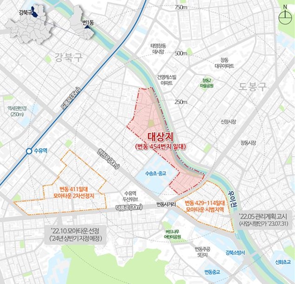 강북구 번동 454 일대는 노후 건축물이 밀집되고 기반시설이 부족해 주거환경이 열악하나 재개발이 어려웠던 노후 저층 주거지였다. 이번 모아타운 지정으로 대상지는 모아주택 3개소가 추진돼 2028년까지 기존 527가구에서 905가구가 늘어난 총 1432가구가 공급될 예정이다.