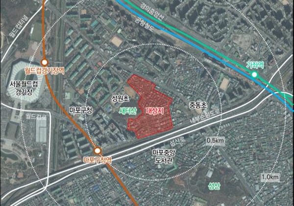 대상지는 반경 500m 이내 마포구청역(6호선)이 인접해 있어 교통이 양호하고, 성원초등학교와 마포중앙도서관이 있어 교육환경도 좋은 편이다. 그러나 노후 저층 주거지역으로 노후 건축물이 밀집되고 기반시설 부족으로 주거환경이 열악해 재개발이 시급한 상황이었다.