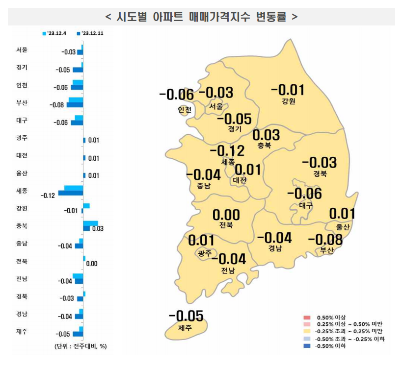 지방(-0.03%)은 시ㆍ도별로 부산(-0.08%), 대전(0.01%), 대구(-0.06%), 충남(-0.04%), 충북(0.03%), 강원(-0.01%), 광주(0.01%), 울산(0.01%), 세종(-0.12%), 전남(-0.04%), 전북(0%), 경남(-0.04%), 경북(-0.03%), 제주(-0.05%) 등의 결과를 보였다.