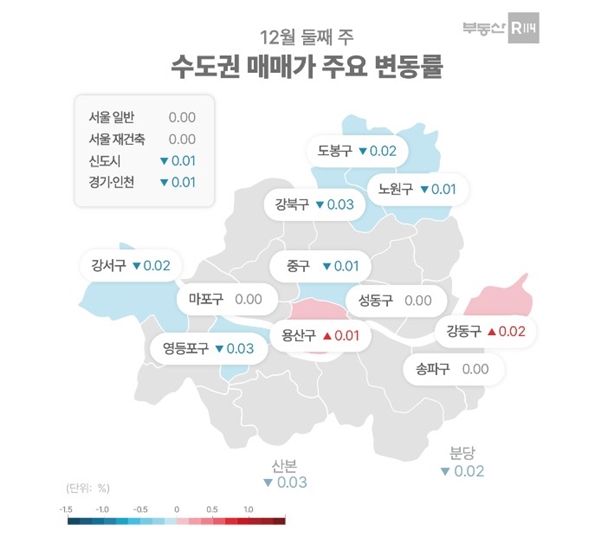서울 25개 구 대부분이 보합(0%)을 나타낸 가운데 중저가 지역 위주로 가격이 빠진 반면 일부 고가 지역은 상승했다. ▲강북(-0.03%) ▲영등포(-0.03%) ▲강서(-0.02%) ▲도봉(-0.02%) ▲노원(-0.01%) ▲중구(-0.01%) 등이 하락한 반면 ▲강동(0.02%) ▲용산(0.01%) 등은 올랐다.
