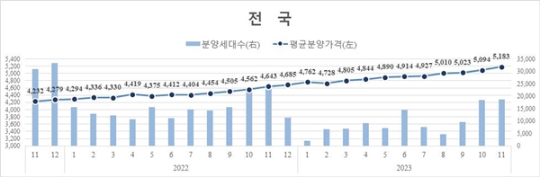 주택도시보증공사(HUG)가 발표한 `11월 말 기준 민간아파트 분양가격 동향`에 따르면 전국 민간아파트 최근 1년간 ㎡당 평균 분양가격(공급면적 기준ㆍ이하 ㎡당 평균 분양가격)은 지난 11월 말 기준 518만3000원으로 전월 대비 1.74% 상승했다. 전년 동월(464만3000원)과 비교하면 11.63% 오른 가격이다.