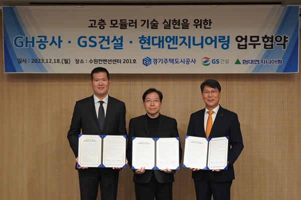 [아유경제=조명의 기자] 경기주택도시공사(GH)는 이달 18일 경기 수원시 컨벤션센터에서 현대엔지니어링, GS건설과 고층 모듈러 기술 실현을 위한 상호협력 업무협약(MOU)을 체결했다고 밝혔다.