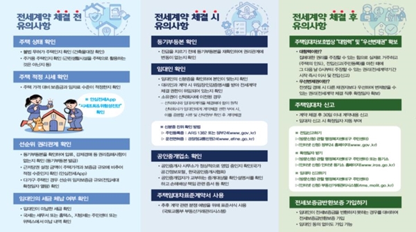 홍보물에 담긴 전세계약 유의 사항은 크게 ▲계약 전 ▲계약시 ▲계약 후로 구분돼 있다. ▲계약 전에는 무허가ㆍ불법 건축물 여부, 적정 전세가율, 선순위 권리관계를 확인하고, ▲계약시 임대인 신분, 공인중개사 정상 영업 여부를 확인하고 계약서의 경우 주택임대차 표준계약서를 활용한다. ▲계약 이후에는 주택임대차 신고와 전입신고를 하고 전세보증금 반환보증 가입을 권고하는 것이 주 내용이다.