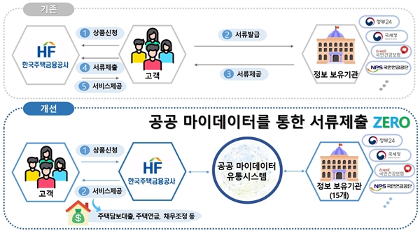 기존에는 주택금융 서비스를 신청하는 고객은 주민등록표 등ㆍ초본, 건강보험자격득실확인서, 소득금액증명원 등의 각종 서류를 개별 기관 등에서 발급받아 HF에 제출해야 했다. 그러나 해당 서비스 도입으로 고객이 HF 누리집 또는 스마트주택금융 앱에서 보금자리론 신청 등 18개 업무 처리시 `본인정보 제3자 제공요구` 한 번으로 필요 서류들을 제출할 수 있게 됐다.