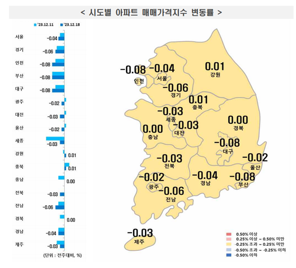 지방(-0.04%)은 시ㆍ도별로 부산(-0.08%), 대전(-0.03%), 대구(-0.08%), 충남(0%), 충북(0.01%), 강원(0.01%), 광주(-0.02%), 울산(-0.02%), 세종(-0.03%), 전남(-0.06%), 전북(-0.03%), 경남(-0.04%), 경북(0%), 제주(-0.03%) 등의 결과를 보였다.