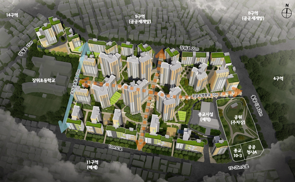 성북구 장위동 68-37 일대 9만1362㎡를 대상으로 한 장위10구역은 재개발사업을 통해 앞으로 2004가구가 공급될 예정이며, 이 중 공공주택 341가구는 분양 주택과 혼합 배치하도록 계획했다.