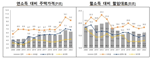 조사 결과 지난해 자가가구의 연소득 대비 주택가격 배수(PIR)는 수도권이 9.3배(중위수)로 집계됐다. 전년(10.1배)보다 줄어든 수치다. 전국 기준으로는 6.3배로 전년(6.7배) 대비 소폭 감소했다. 광역시 등은 6.8배로 전년(7.1배)보다 줄었고 도 지역은 4.3배로 전년(4.2배)보다 소폭 상승했다. PIR는 받은 월급을 모두 모아 집을 장만하는 데 걸리는 시간을 뜻한다.