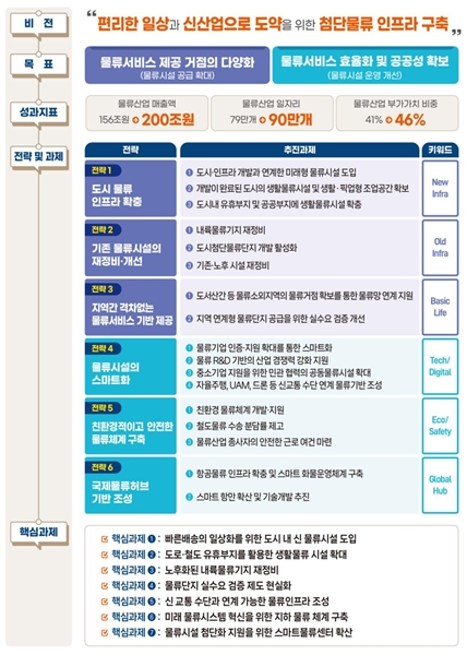 이와 함께 6대 추진 전략으로 ▲생활밀착형 도시 물류 인프라 확충 ▲노후화된 기존 물류시설 재정비 및 개선 ▲지역 간 격차 없는 서비스 기반 제공 ▲물류시설의 스마트화 ▲친환경적이고 안전한 물류체계 구축 ▲국제물류허브 기반 조성 등을 계획을 마련했다.