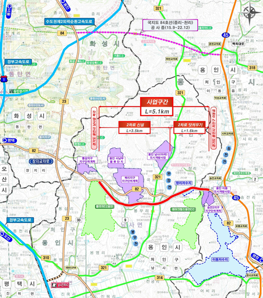용인 장지~남사 국가지원지방도 도로건설공사는 용인시 처인구 남사읍 북리에서부터 이동읍 송전리까지 총 5.1㎞ 구간에 2차로 신설(3.5㎞)과 2차로 덧씌우기(1.6㎞)를 추진하는 사업으로 총사업비 789억 원이 투입된다.