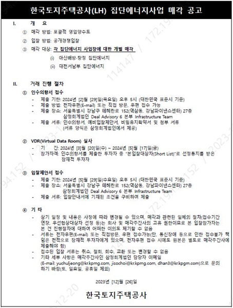 이후 2024년 3월 본입찰대상자 선정, 2024년 5월 본입찰 예정이며, 매각과 관련한 상세한 사항은 LH홈페이지 공모 안내에 게시된 `LH 집단에너지사업 매각공고문`을 통해 확인할 수 있다.