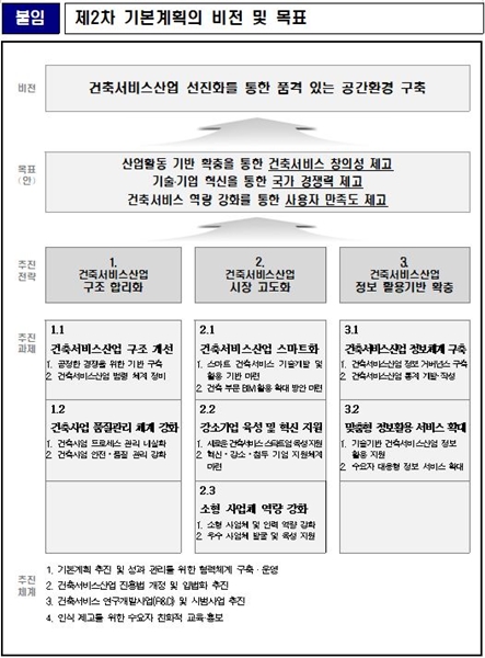 이번 기본계획은 `건축서비스산업 선진화를 통한 품격 있는 공간환경 구축`을 비전으로 설정하고, 산업 구조 합리화, 시장 고도화 및 정보 활용기반 확충 등 3대 추진 전략, 7대 추진 과제를 선정했다.