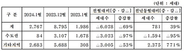 전월(8795가구) 대비 6028가구(-69%) 감소했으며 전년 동월(1986가구)에 비하면 781가구(39%) 증가했다.