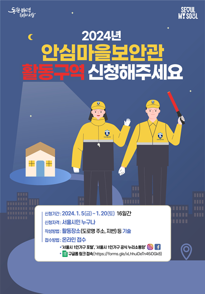 활동 구역 신청은 오는 20일까지 ▲서울시 1인 가구 포털 ▲1인 가구 공식 누리소통망(인스타그램ㆍ페이스북) ▲구글폼링크에서 안심마을보안관을 배치하고 싶은 지역(주소 기재)과 추천 사유를 작성해 제출하면 된다.