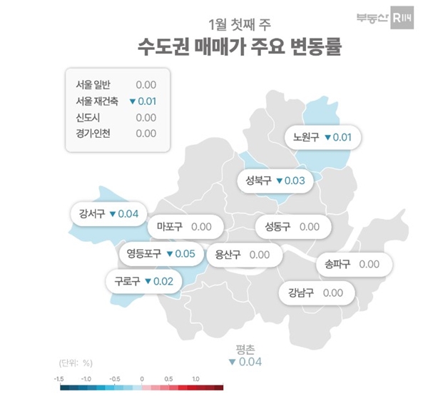 이달 5일 부동산R114에 따르면 올해 첫째 주 서울 아파트 매매가격은 4주 연속 보합(0%)을 나타내다 0.01% 떨어지며 내림세로 돌아섰다. 재건축이 0.01% 떨어졌고 일반 아파트는 가격 움직임이 없었다.
