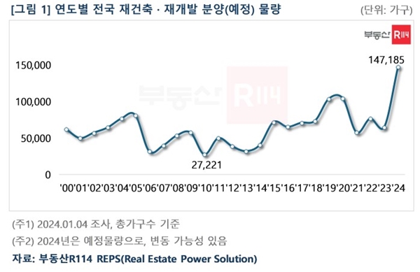 이달 9일 부동산R114에 따르면 올해 재개발과 재건축을 통한 분양계획 아파트는 전국 총 14만7185가구로, 조사를 시작한 2000년 이후 최다 물량으로 집계됐다. 가장 실적이 저조했던 2010년 2만7221가구과 비교해 5배 이상 많은 수치다.