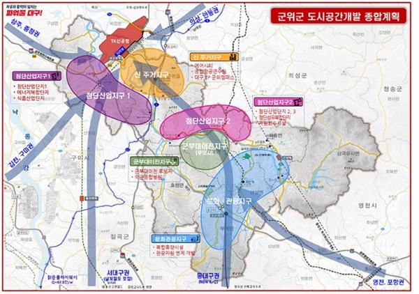 이날 대구시가 발표한 `군위군 도시공간개발 종합계획`에 따르면 첨단산업1ㆍ2지구, 신주거지구, 문화ㆍ관광지구, 군부대이전지구(후보지)로 구분하고, 공항신도시ㆍ공항산업단지ㆍ공무원연수시설ㆍ맑은물 하이웨이 등 핵심사업과 연계한다. 도시 확장성과 균형발전 측면을 고려해 교통망, 미래형 에너지, 정수장, 소각장ㆍ매립장, 하ㆍ폐수처리장 등 사회기반시설 계획도 갖출 계획이다.