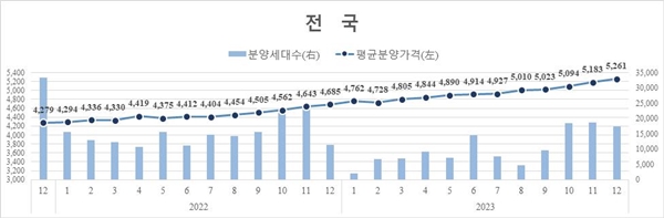 [아유경제=조명의 기자] 2023년 12월 민간아파트 분양가격이 10개월 연속 상승세를 기록했다.