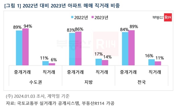 [아유경제=조명의 기자] 2023년 아파트 매매 직거래 비중이 전년에 비해 감소한 것으로 조사됐다. 특히 수도권 직거래 비중이 절반 이하로 축소됐다.