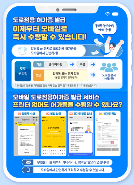 앞으로는 전자문서 형태의 도로점용 허가증을 모바일로 빠르게 발송해 신청인이 허가증을 기다리거나 관리청에 찾아가지 않고도 쉽게 조회하거나 수령할 수 있다.