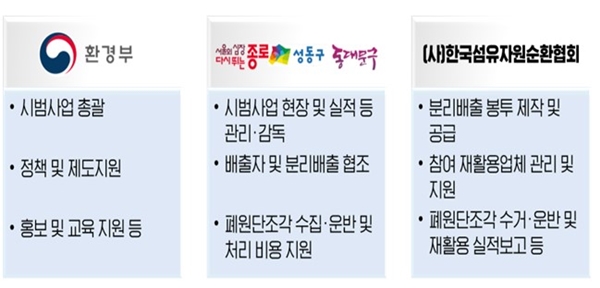 이번 협약에 참여한 서울시 3개 자치구는 전용 수거봉투(마대)에 폐원단 조각이 재질별로 분리배출 되도록 현장에서 지원하고, 적정하게 수집ㆍ운반ㆍ재활용될 수 있도록 처리비용 등을 보조할 예정이다.