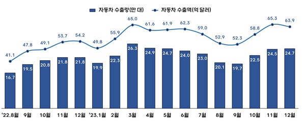 [아유경제=조명의 기자] 2023년 자동차 수출액이 총 700억 달러를 넘어서며 사상 최고치를 경신했다. 친환경차 수출이 증가하고 수출단가가 상승한 것이 주효했다는 분석이다.