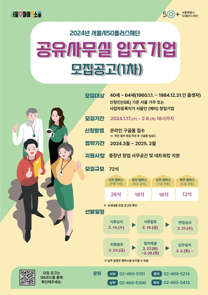 [아유경제=송예은 기자] 서울시50플러스재단은 이달 17일부터 50플러스캠퍼스 내 공유사무실 입주기업을 모집한다고 밝혔다. 대상은 사무공간이 필요한 중장년 창업기업이다.