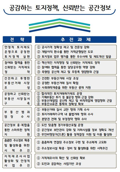 추진 계획은 ▲안정적 토지제도 운영으로 공정한 토지 정책 실현 ▲참여와 협력을 통한 신뢰받는 지적제도 정착 ▲건전하고 투명한 부동산거래시장 조성 ▲공정하고 신뢰받는 부동산 시장 질서 구축 ▲부동산범죄 엄정 수사 ▲공간정보 융ㆍ복합을 통한 스마트한 정책 지원 ▲촘촘한 주소정보 확충 및 활성화를 위한 시책 추진 ▲지적재조사사업 활성화 및 안정적 사업 추진 등 8대 전략을 바탕으로 한 86개 세부 이행 과제로 구성됐다.
