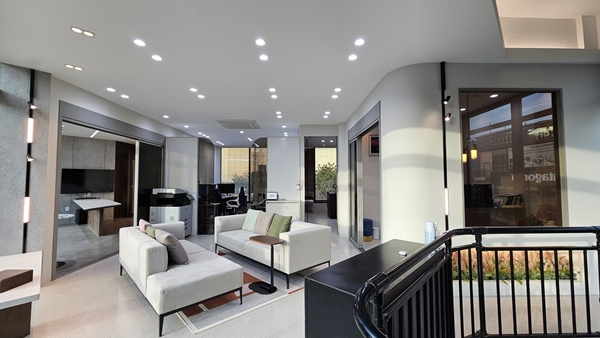 1층 쇼룸은 욕실, 키친 등 각 생활공간에 최적화된 스마트홈 자동화 솔루션을 체험할 수 있다. 응접실의 커튼과 조명을 제어해 주는 미팅 모드와 한번의 컨트롤로 일시소등이 가능한 퇴실 모드, 키친에서 안전한 조리를 위한 쿠킹 모드와 분위기 있는 식사를 위한 다이닝 모드를 선보인다. 복도에서는 조명의 색온도 전환에 따른 실내 분위기 변화도 체험할 수 있다. 움직임이 감지되거나 배치된 컨트롤러를 작동하는 경우 자동으로 조명 조절이 가능하다.